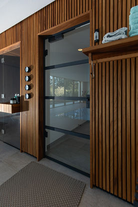 Selbstverständlich liefern wir auch individuelle Stangen- und Profilgriffe in der passenden Optik dazu. Auch im Zugang zum Pool-Bereich wurde eine Tür im Sprossendesign verbaut – hier allerdings als Drehtürelement mit Schlosskasten. Besonderes Highlight ist sicher auch der frei hängende und drehbare Spiegel mit integriertem LED-Licht in der Spiegelfläche. Weitere Elemente wie raumhohe Glasduschwände und Spiegellösungen runden das Objekt vielfältig als Referenz für uns detailliert ab. Die Lösungen verbinden Design, Funktionalität und Tageslichtnutzung auf höchstem Niveau und sind perfekt abgestimmt auf die moderne Architektur des Gebäudes.